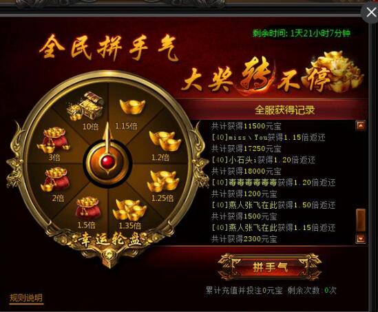 开服第1-2天玩家累计充值达到X元宝后,并且消耗X元宝可以进行转盘抽奖,抽取的奖励倍数*本金则是这次获得元宝数量