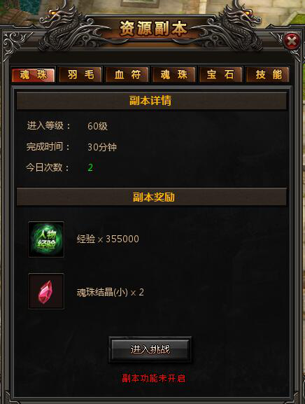 每日可在比奇城内的资源副本处接取塔防副本任务,完成后可获得经验,羽毛,血符,宝石奖励。